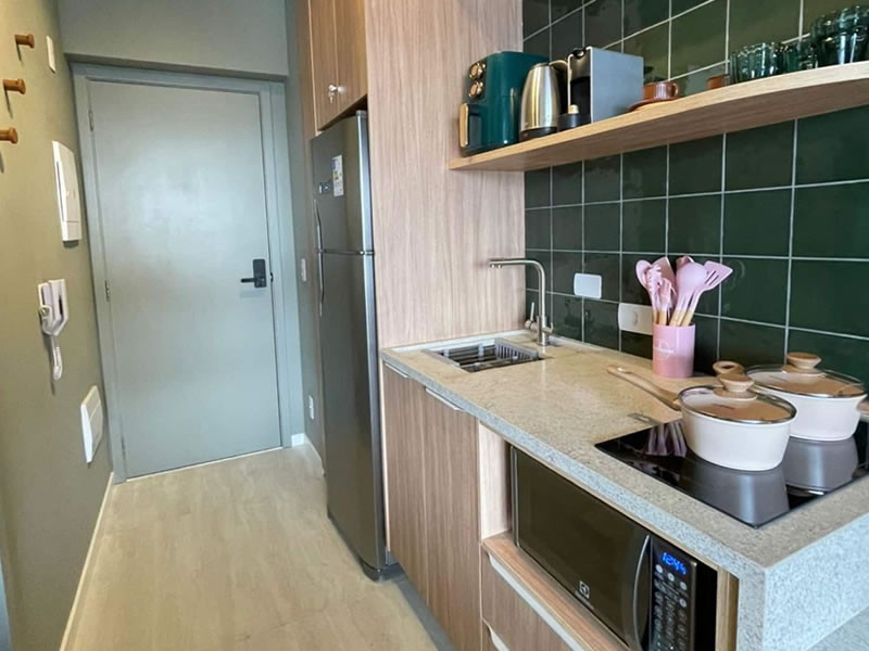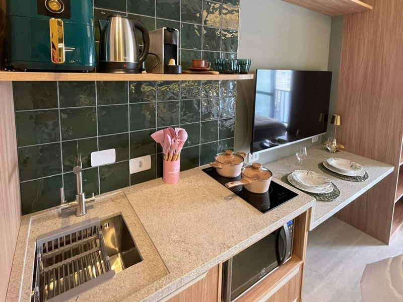 Cozinha equipada com Airfryer, cafeteira e utensílios para preparo de uma boa refeição.